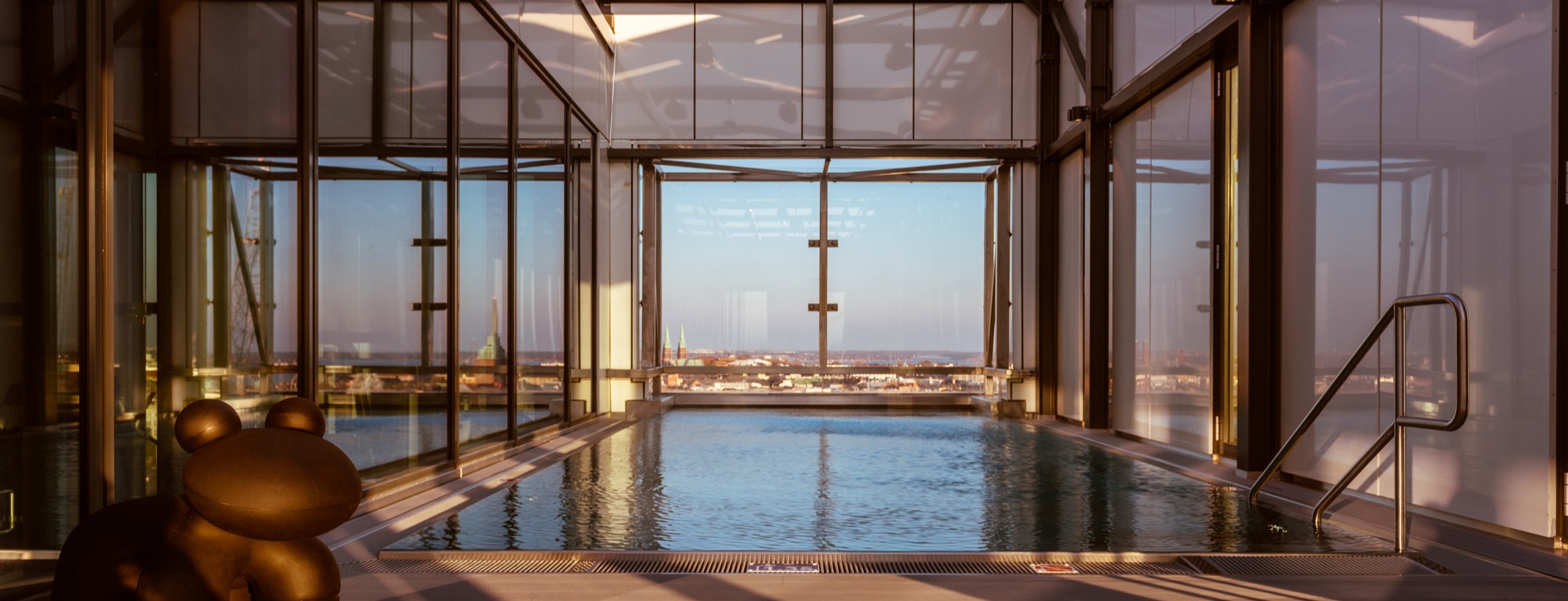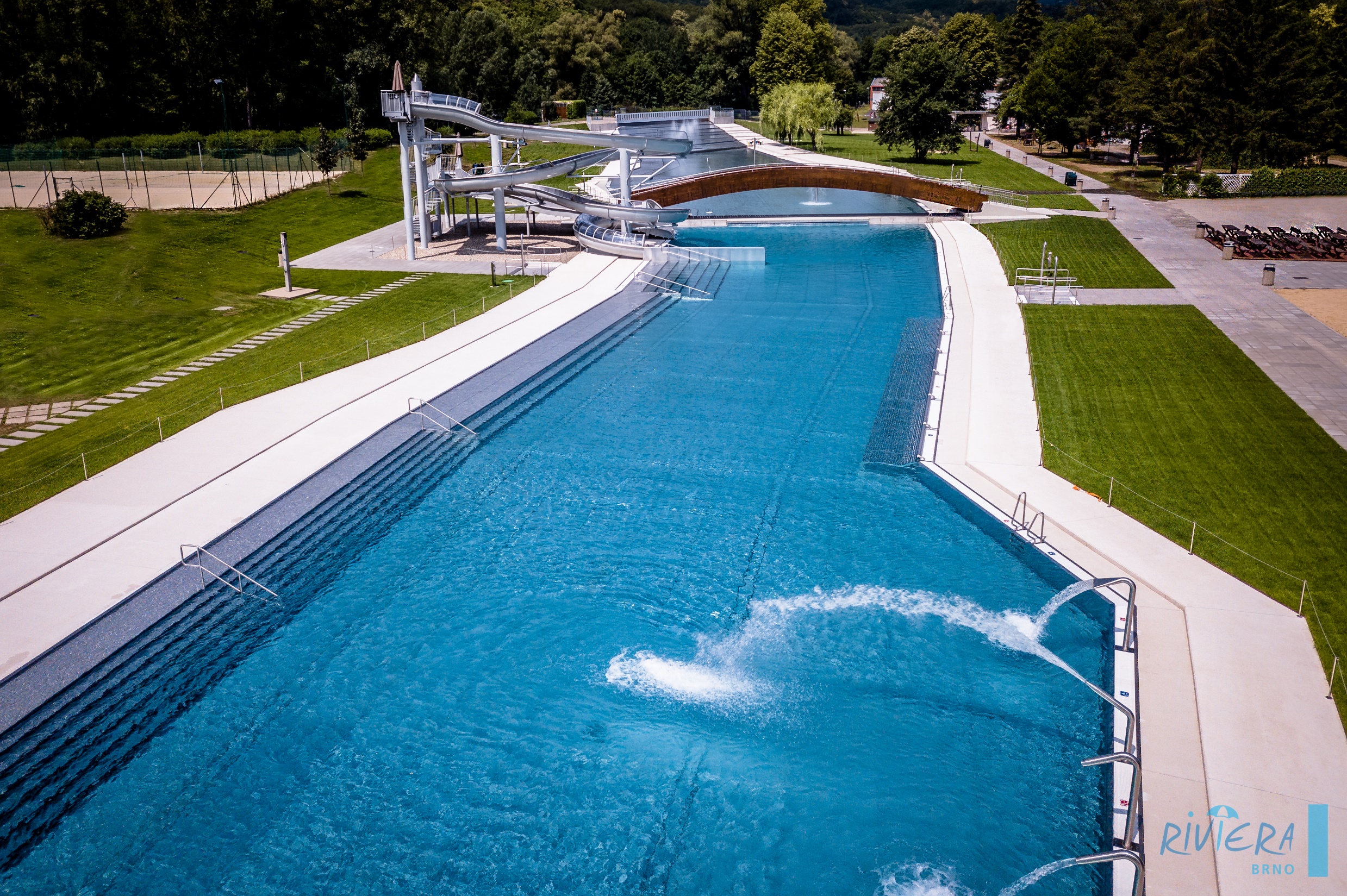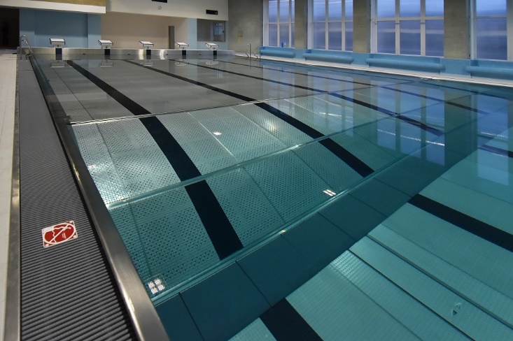 This 25 × 10 metre stainless steel swimming pool, with a maximum depth of 1.7 metres, features a state-of-the-art movable floor covering one-third of the pool area.